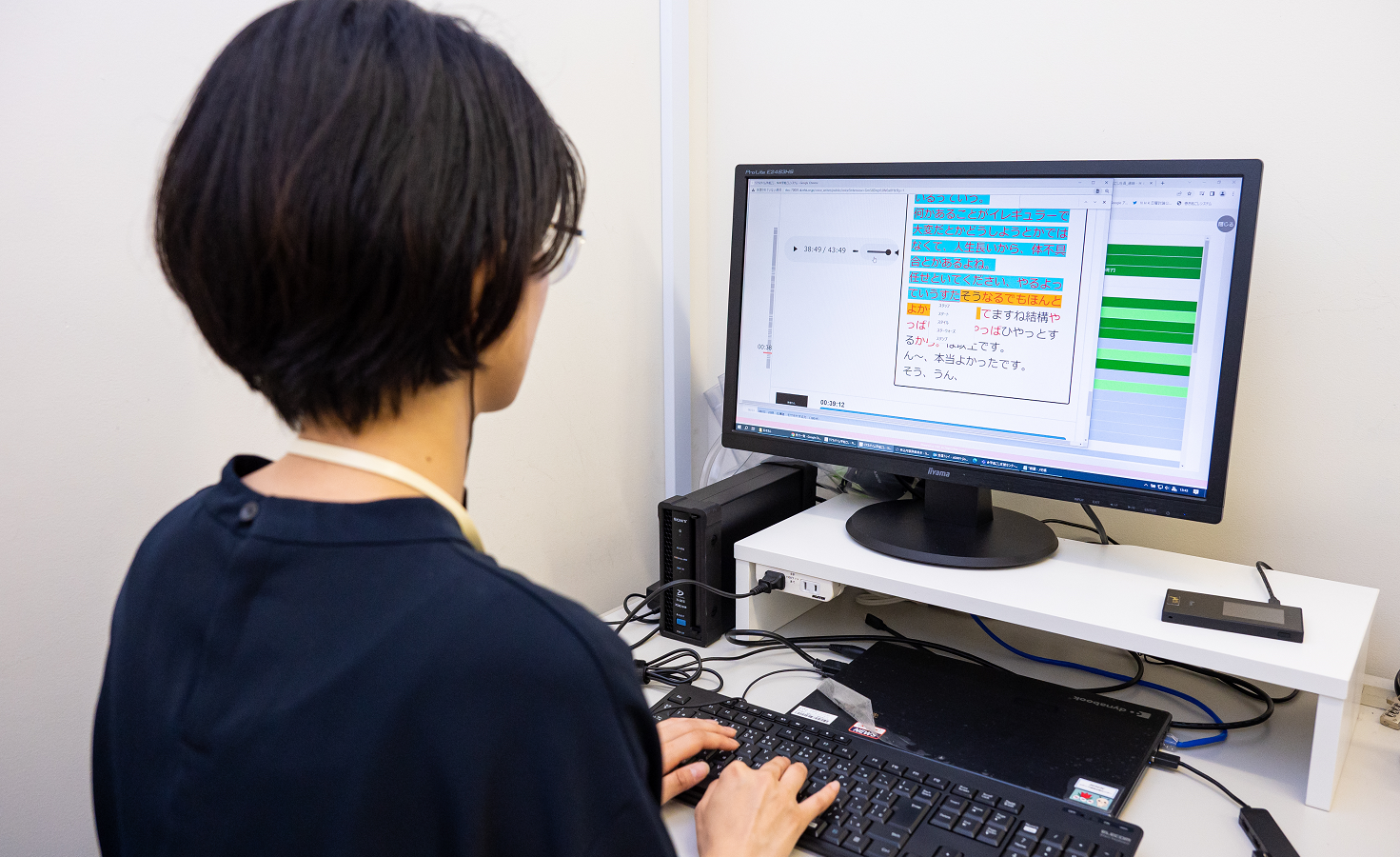 字起こし支援という事業において、効率化は大切な要素です。その点、私たちは自社で開発した字起こしシステムを利用しています。どこを触れば何ができるのか、一度習えばすぐに理解できるように工夫されているため、操作に迷うことなく、効率よく作業に集中できます。実際に使うユーザ視点をもとにつくられているので、ミスも起きにくい。自社のことながらも、高い開発力とユーザ視点を兼ね備えた会社なんだな、と実感します。また、各メンバーが作業に集中できるように配慮された環境があるのもポイント。都内の放送センター内にひとりずつ専用の端末が用意されているので、効率的に仕事に向き合うことができるんです。