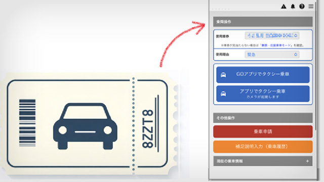 申請して発行されたチケットからタクシー乗車が可能です。社内での支払いが発生しないためスムーズな乗降が可能です。